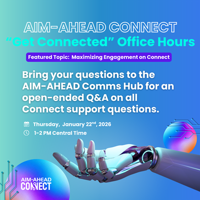 About the AIM-AHEAD "Get Connected" Office Hours: "Get Connected" Office Hours are biweekly support sessions with an open-ended Q&A format where AIM-AHEAD Connect users can bring any question related to utilizing and navigating the AIM-AHEAD Connect platform. Each support session will include comprehensive walk-throughs and demonstrations on various innovative features of AIM-AHEAD Connect - each designed to increase resource awareness and proficiency. The series also includes a featured topic for the support session and direct access to additional platform training resources.