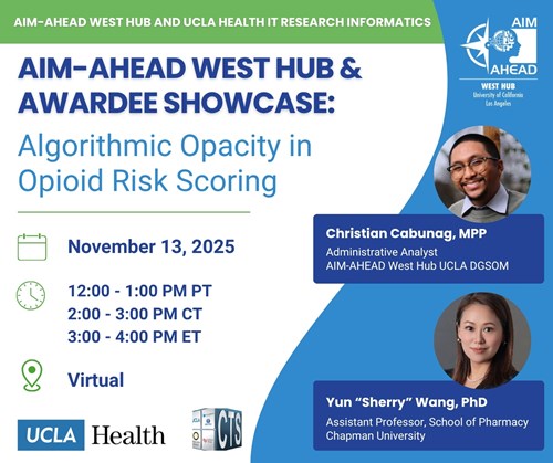 You’re invited to join the AIM-AHEAD West Hub & Awardee Showcase with Christian Cabunag and Dr. Yun “Sherry” Wang on Thursday, November 13, 2025 from 2 - 3 p.m. Central Time via Zoom. During this session, Christian will highlight the AIM-AHEAD West Hub, housed at UCLA and supported by the NIH Office of Data Science Strategy, which advances research, training, and community partnerships in Artificial Intelligence (AI) and Machine Learning (ML). Additionally, we will showcase the work of one of our AIM-AHEAD awardees, Dr. Wang, who will present her research on Algorithmic Opacity in Opioid Risk Scoring and the Need for Transparent AI Regulation in Healthcare, exploring the broader implications of AI in clinical decision-making.